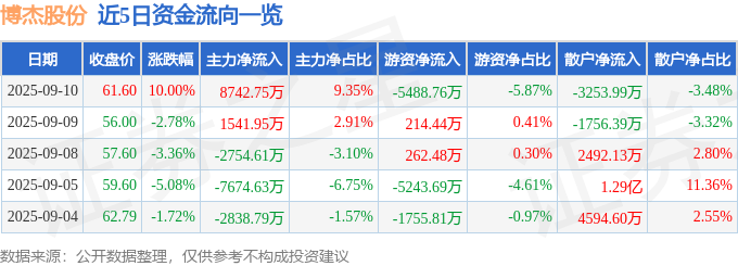 证券之星消息,截至2025年9月10日收盘,博杰股份(002975)报收于61.6元,上涨10.0%,涨停,换手率14.93%,成交量15.81万手,成交额9.35亿元。
